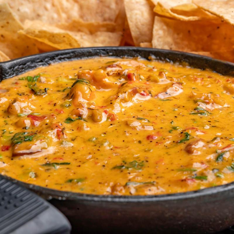 crawfish, shrimp, andouille sausage, red onions, peppers, cheese, cilantro. served with house-made tortilla chips.