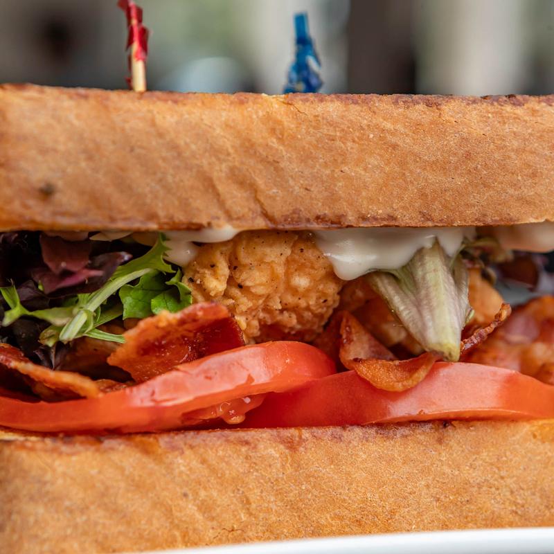 fresh-cut salmon, battered, fried, applewood bacon, lettuce, tomato, roasted garlic aioli, and texas toast. served with fries.