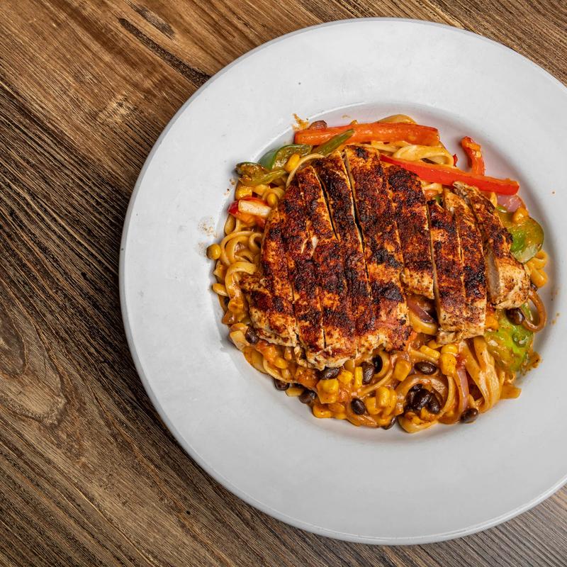 grilled chicken breast, red and green peppers, red onions, black beans, corn, tomato, alfredo, southwest seasoning.