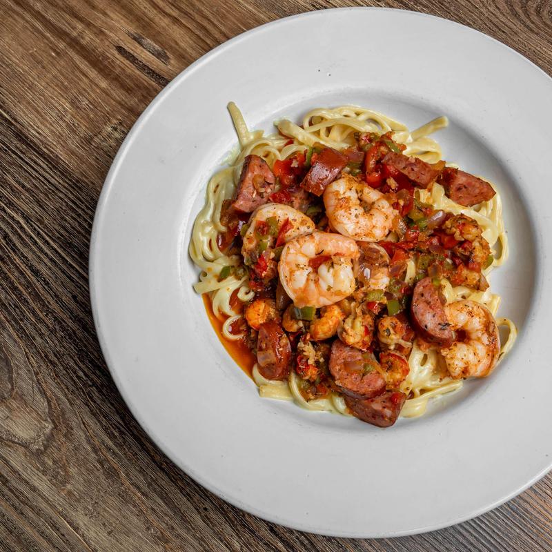 blackened shrimp, crawfish, andouille sausage, onions, and peppers. served over fettuccine.