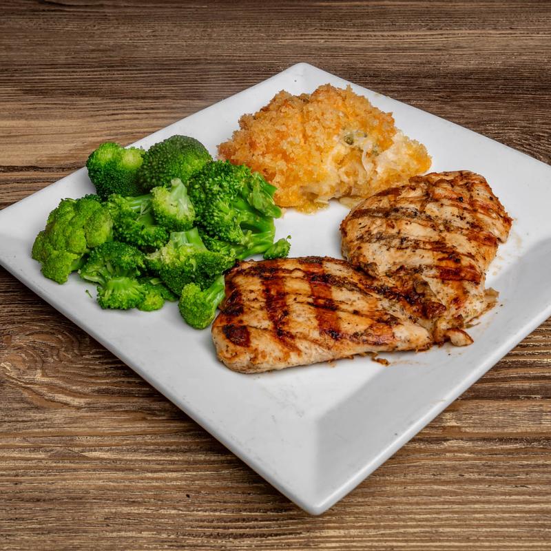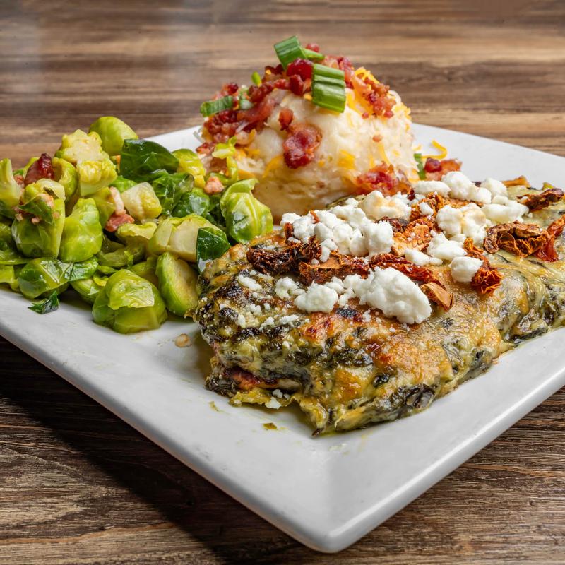 grilled chicken breast, creamed spinach, goat cheese, sun-dried tomatoes. served with two sides.
