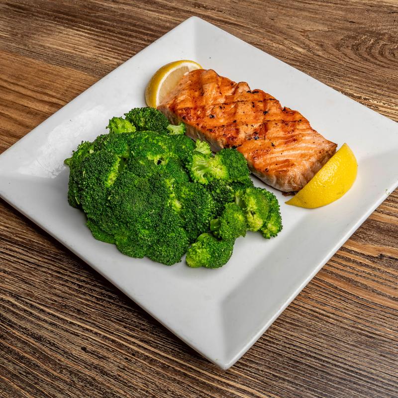 fresh fillet salmon, blackened, lemon pepper, or bourbon glaze. served with two sides.