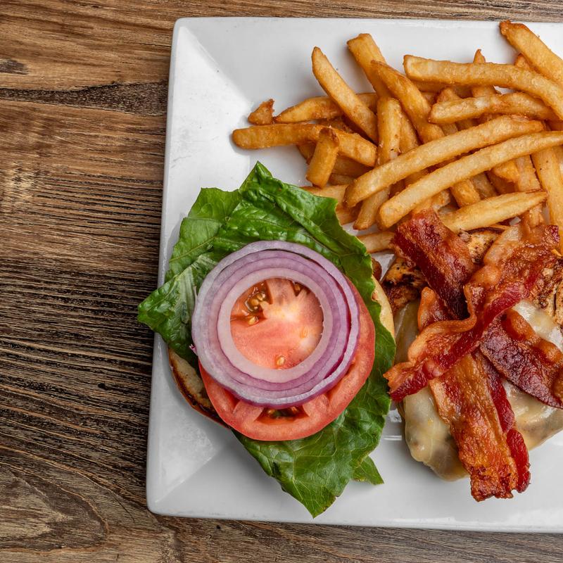 grilled, fried, or spicy, bacon, provolone, lettuce, tomato, onions, and a brioche bun.