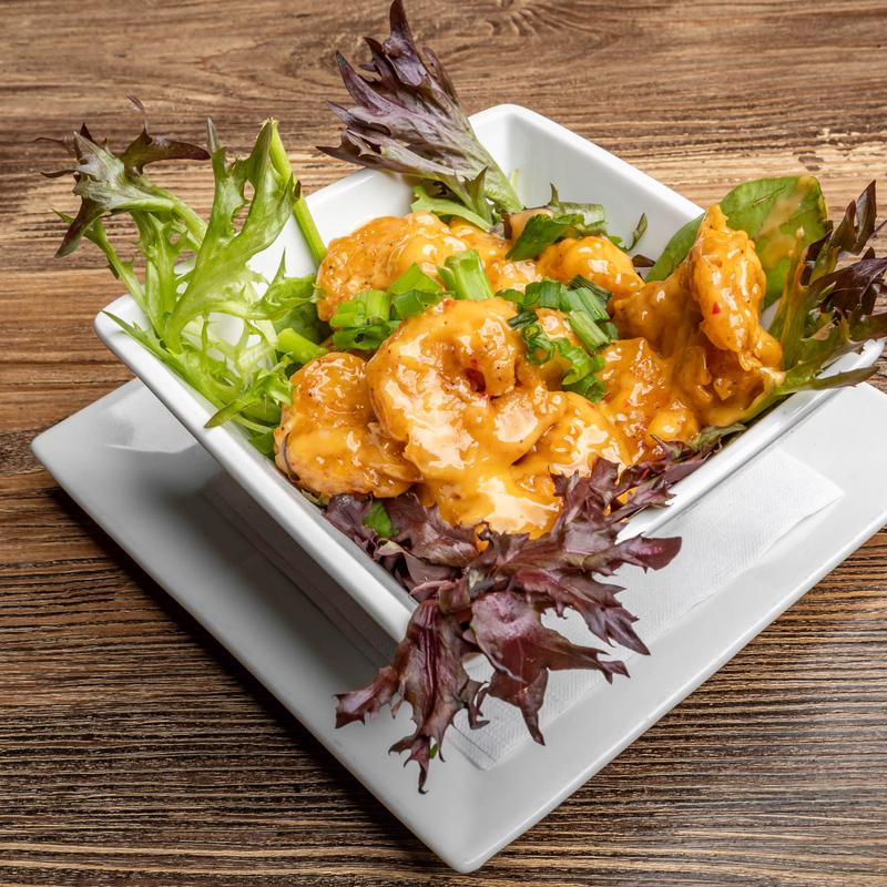 shrimp, hand-battered, tossed in our house-made white dog sauce.