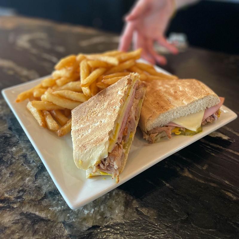 pork, ham, swiss cheese, pickles, mustard, pressed cuban bread.